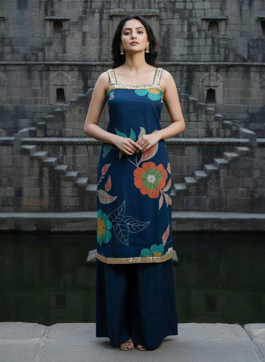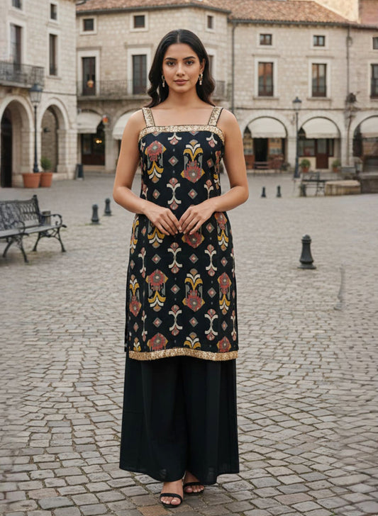 Elevate your wardrobe with this sophisticated black berry embroidered sleeveless co-ord set. Featuring intricate berry...