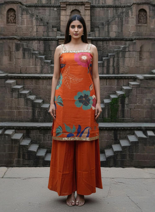 Elevate your ethnic wardrobe with this stunning teak orange A-line co-ord set, meticulously crafted for...