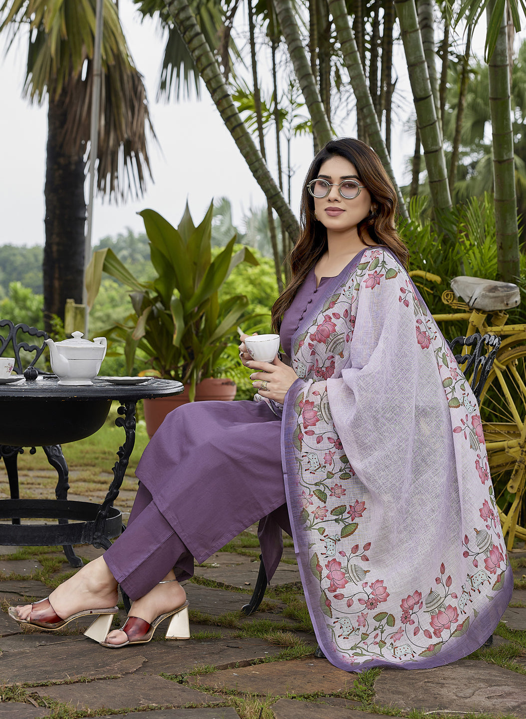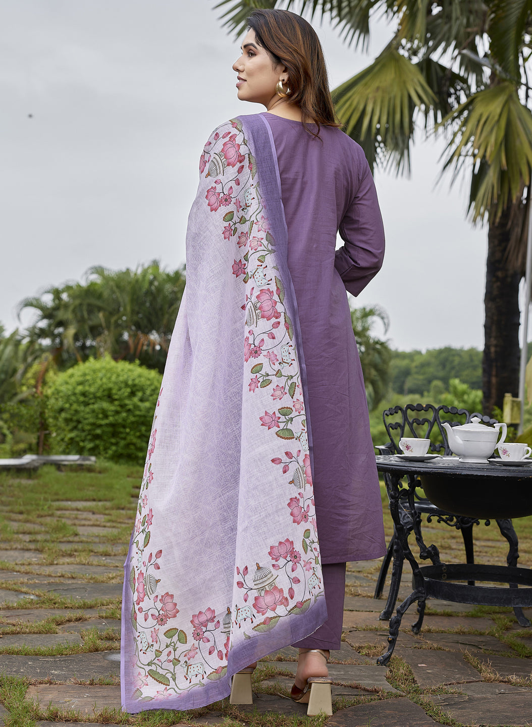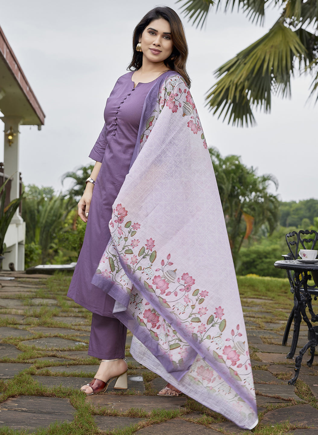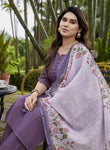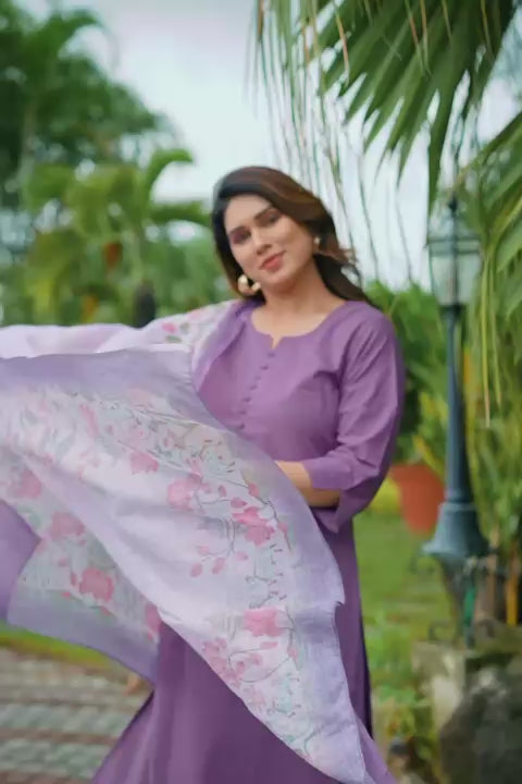 This ensemble features a resplendent notch coller purple pure cotton kurta and pant set. The kurta, a masterpiece of subtle elegance, is adorned with meticulously crafted fabric buttons, tonal pants adding a touch of classic charm. Draping with ethereal grace is a high-quality linen dupatta, a true testament to refined textile artistry. This dupatta serves as a magnificent canvas for Pichwai prints, an art form deeply rooted in the cultural heritage. Here, the lotus flowers bloom in various captivating stages, their vibrant hues rendered with remarkable detail, evoking a sense of divine beauty and tranquility. The delicate interplay of lush green leaves further accentuates the beauty of the blossoms, creating a harmonious and vibrant tableau. This attire is a symphony of rich tradition and contemporary elegance, offering both comfort and an undeniable aura of sophisticated grace."