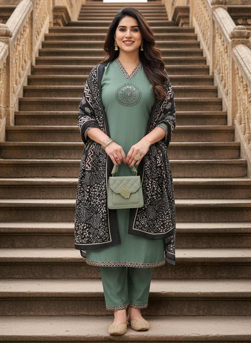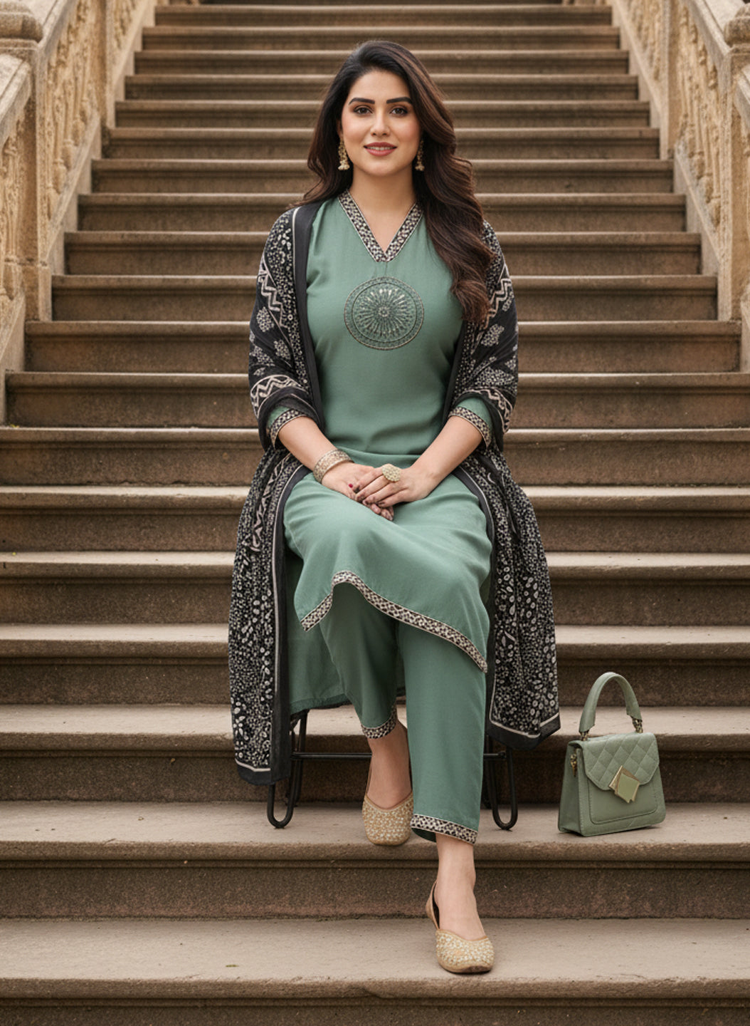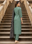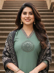 The kurta pant set is crafted from a comfortable art silk fabric in a olive green colour providing a sleek and sophisticated canvas. The V-neckline is a stylish detail, beautifully enhanced with handcrafted block print intricate handwork and detailed embroidery that adds a touch of artisanal craftsmanship. The straight-fit kurta is complemented by matching tonal pants, creating a cohesive and classic silhouette added by laces on hemline and bottom.