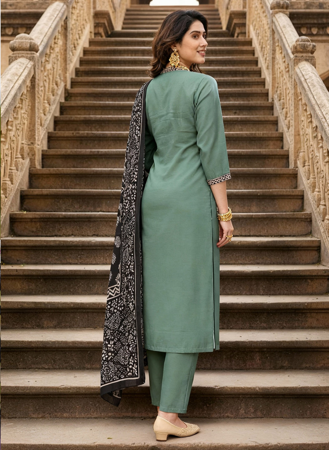 The set is elevated by a stunning dupatta made from pure Maslin fabric. The dupatta showcases traditional Ajrakh print with a rich, striking color palette of Beige, and deep black, intricately woven into a repetitive pattern. Both the kurta's hemline and the dupatta's borders feature delicate lace trim, which provides a polished and finished look. This traditional ensemble is available in a range of sizes, including plus sizes, ensuring a comfortable and flattering fit for all body types.