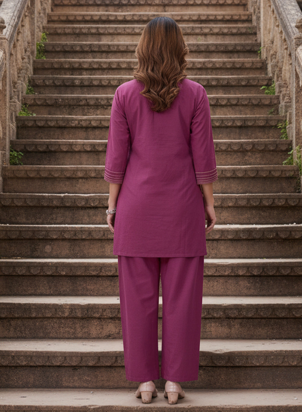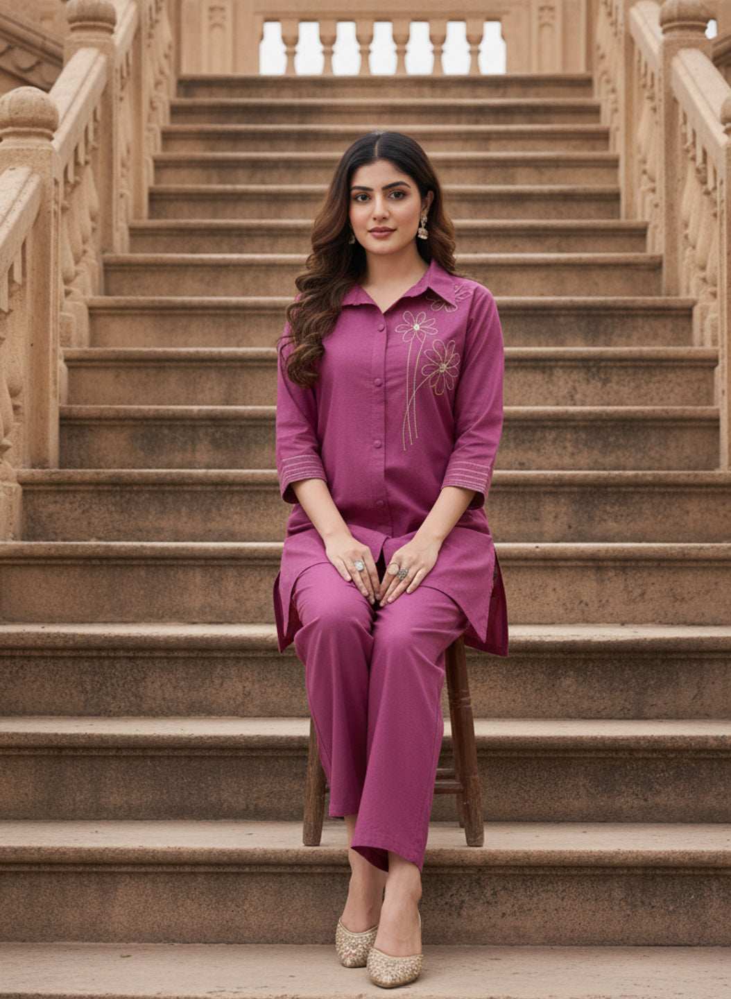 Elevate your everyday wardrobe with this pure cotton embroidered co-ord set, expertly crafted for versatile styling. The intricate embroidery detailing adds sophisticated charm to the coordinated pieces, making them perfect for casual outings or relaxed gatherings. Constructed from breathable pure cotton, this set ensures comfort throughout the day while maintaining its shape and color. The coordinated design allows you to wear the pieces together for a cohesive look or separately to maximize outfit combinations. Ideal for those who appreciate quality craftsmanship and timeless style.