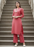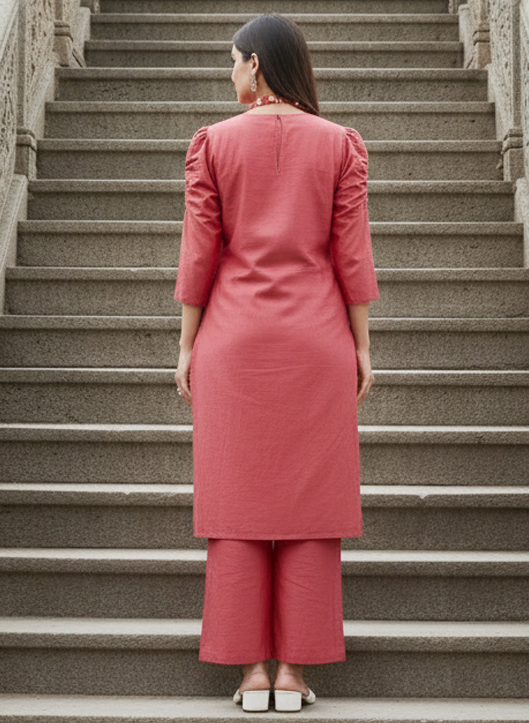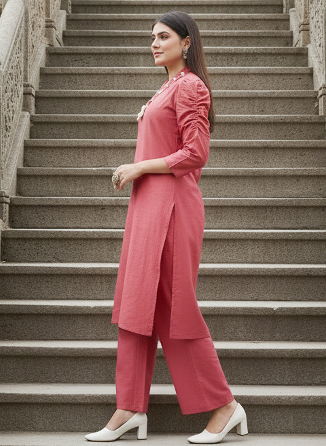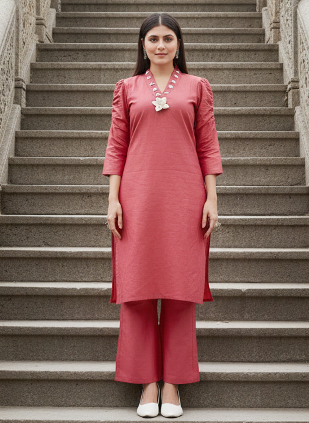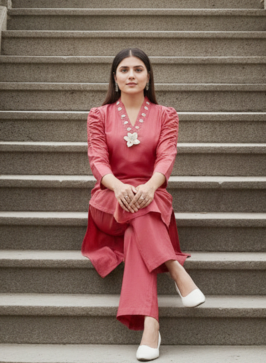 Elevate your wardrobe with this exquisite pure cotton co-ord set, meticulously crafted for the discerning dresser. Featuring hand-embellished jute flower detailing and an elegant v-neckline, this ensemble combines traditional artisanal craftsmanship with contemporary style. The fancy sleeves showcase intricate mirror work that catches light beautifully, adding dimension and sophistication to your look. Perfect for festive occasions, casual gatherings, or making a refined statement, this versatile set offers comfort without compromising on elegance. The breathable cotton fabric ensures all-day wearability while the thoughtful design details demonstrate superior attention to quality and aesthetic appeal.