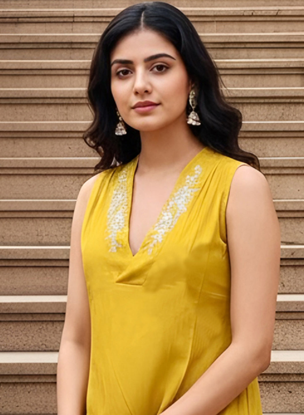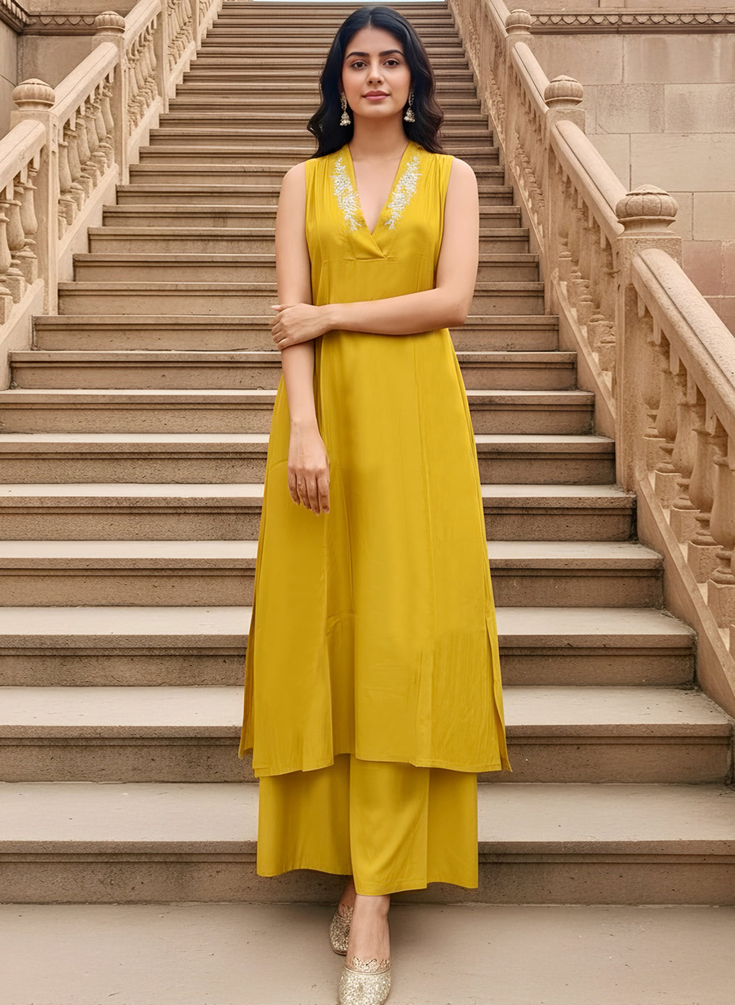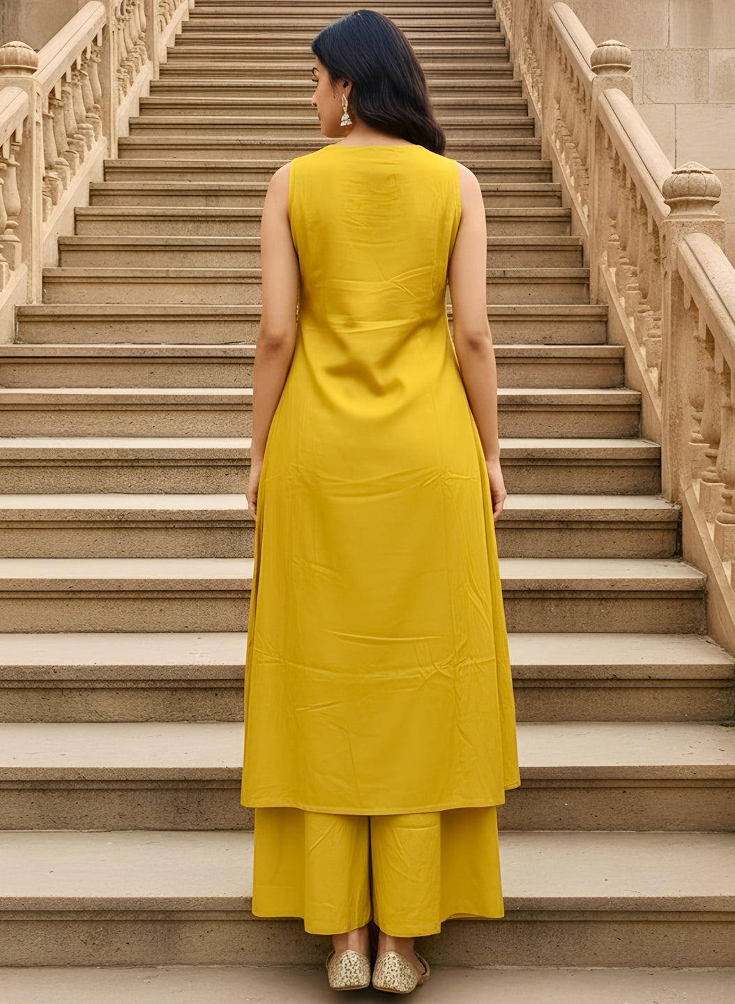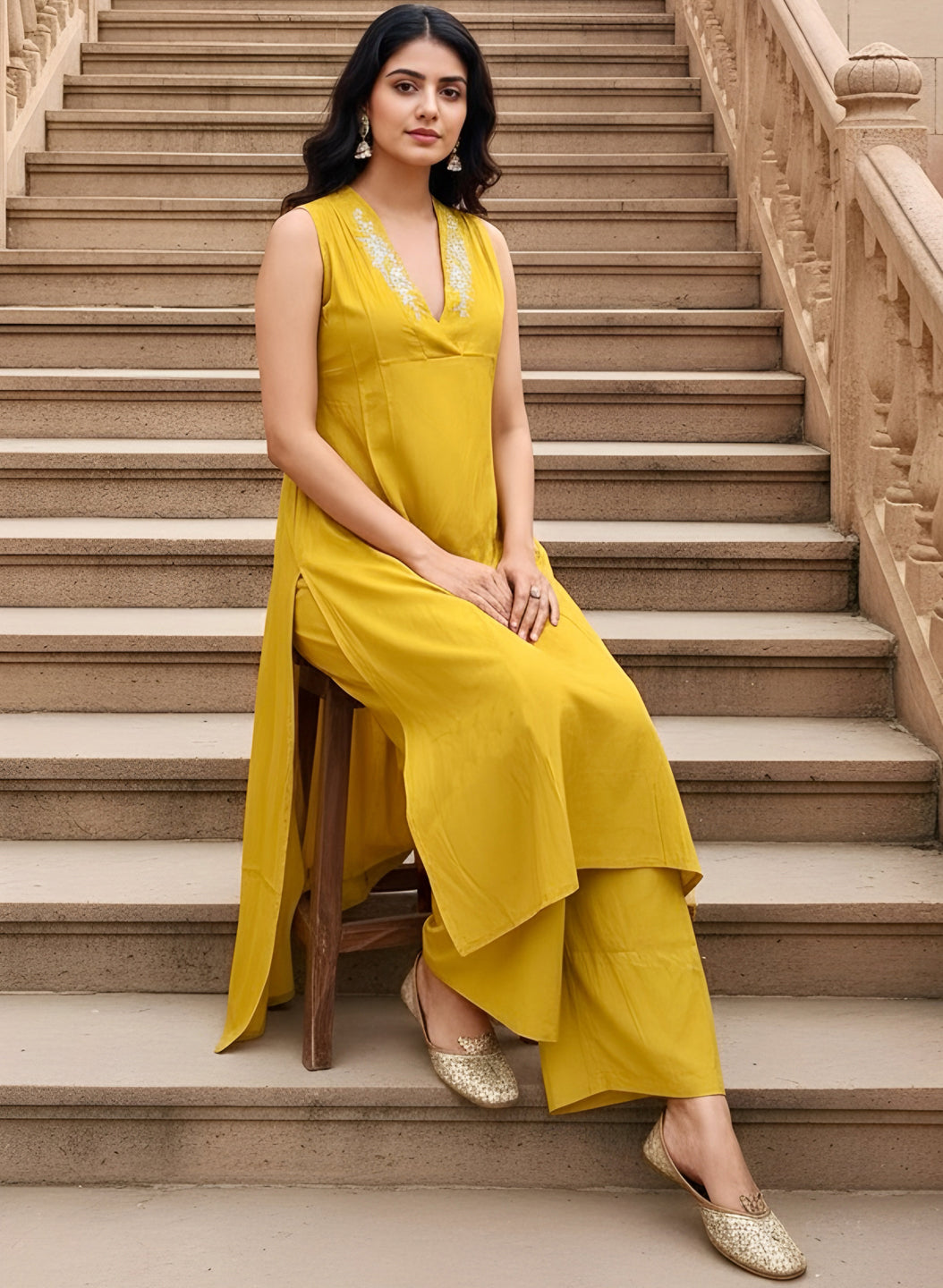 Elevate your ethnic wardrobe with this striking tangy yellow co-ord set, expertly crafted for the modern woman. The A-line silhouette flatters all body types while the sleeveless design ensures breathability and comfort. Intricate embroidery and meticulous hand work create visual depth and sophistication, transforming this set into a statement piece perfect for festive occasions, celebrations, or elevated casual wear. The coordinated top and bottom combination offers versatile styling options while maintaining a cohesive, polished aesthetic. Ideal for those who appreciate traditional craftsmanship blended with contemporary fashion sensibilities.