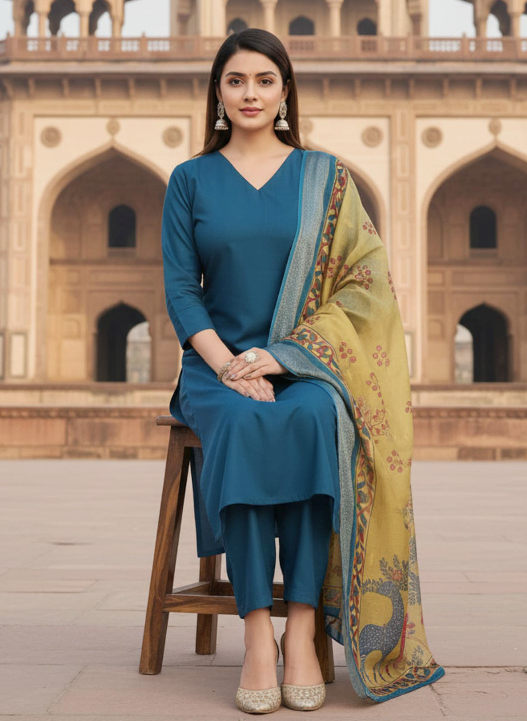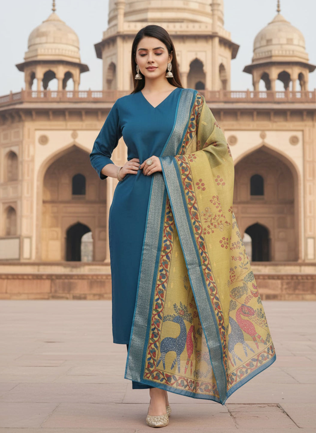 The look is elevated with a Jacquard Chanderi Dupatta in olive tones, beautifully adorned with intricate traditional motifs and a striking folk-inspired animal print along the pallu. The woven jacquard texture and vibrant borders add depth and richness, while the soft drape ensures both comfort and grace.