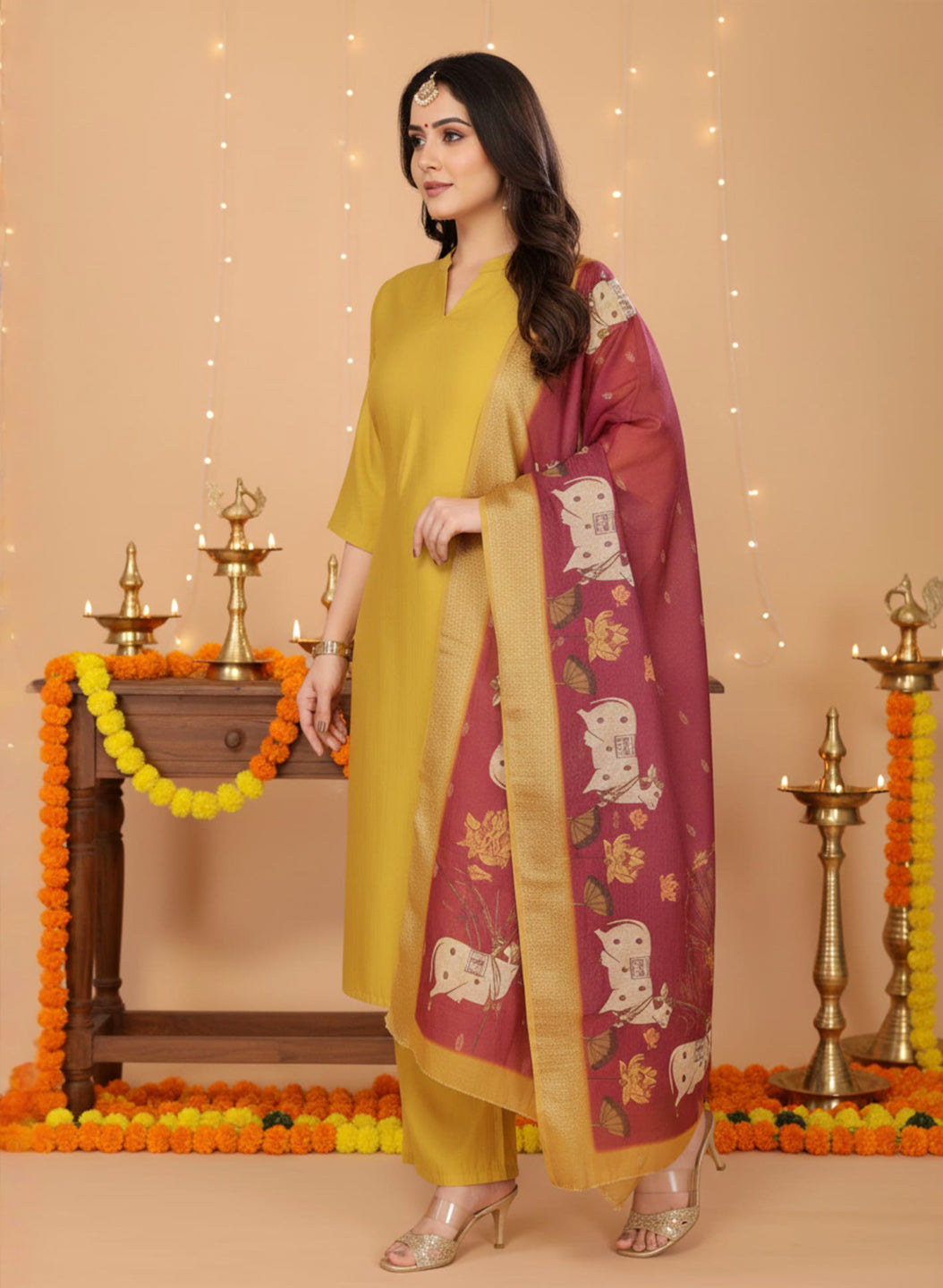 Utsav – Pure viscose Silk Kurta Pant Set with jacquard Chanderi Dupatta