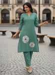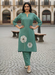 pure cotton embroidered kurta pant set combines traditional craftsmanship with contemporary silhouettes. The kurta features a flattering A-line cut with a refined mandarin collar, extending to calf length for elegant proportions. Intricate mirror embroidery adorns the front and back, creating luminous detailing that catches light beautifully. Crafted from breathable pure cotton, this set offers comfort for all-day wear while maintaining its structured shape. Perfect for festive occasions, celebrations, or elevated everyday styling.